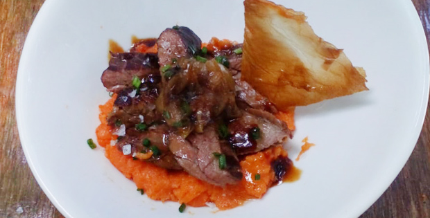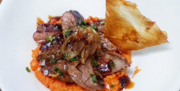 Secreto de ternera con cebolla caramelizada y calabaza al horno HORARIO DE TAPA: De 13:30 a 16:30 y de 19:00 a 22:00.