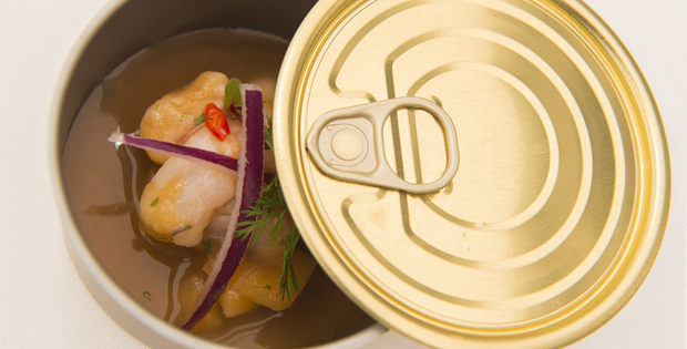 Ceviche de níspero, corvina y quisquilla.