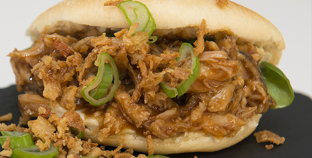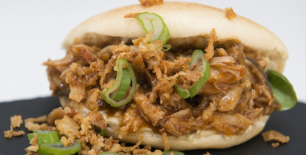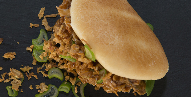 Pan bao relleno de carne de costilla de cerdo y salsa de berenjena con cebolla frita y cebolla fresca.