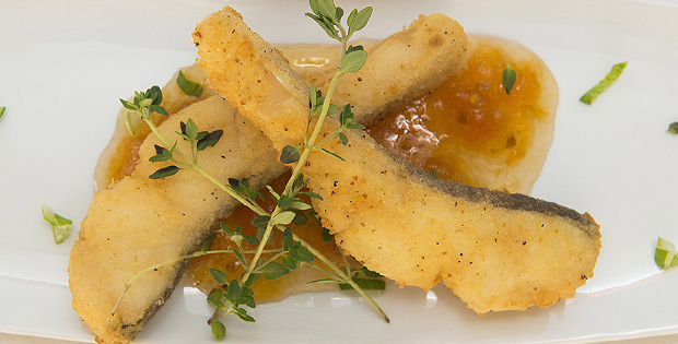 Bacalao frito con mermelada de tomate casero con un toque de romero y decorado con cebollino.
