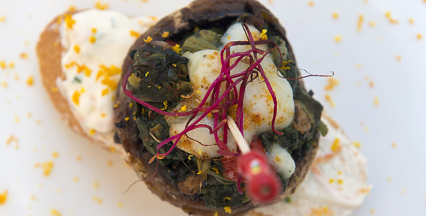 Champiñones rellenos con espinacas y salsa blanca: champiñones, espinaca, cebolla, ajo, pimiento rojo, pasas, queso manchego con trufa, sal, pimienta negra, yogur cremoso, mayonesa, zanahoria, perejil fresco y naranja.