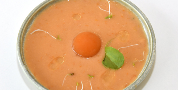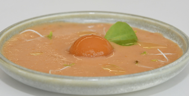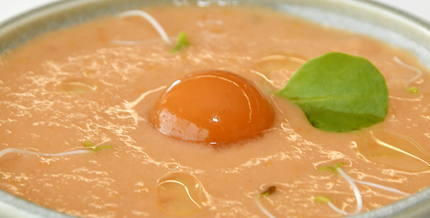 Las texturas refrescantes del tomate con jamón ibérico y sus germinados.