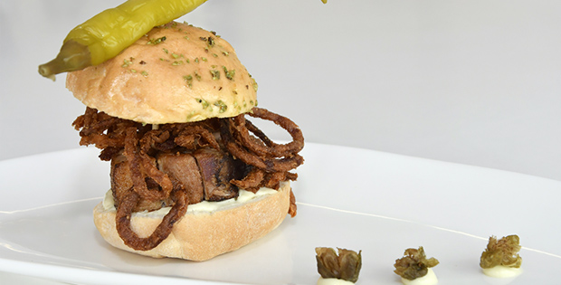 Montadito de panceta a baja temperatura, con mayonesa japonesa, chili y guindilla vasca.