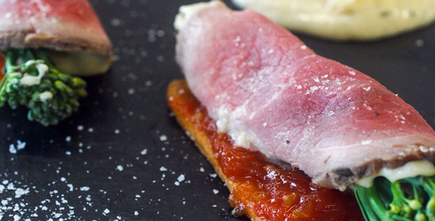 Descripción: Roastbeef sobre una tosta relleno de una salsa de varios quesos, Jack Daniels y bimi con crujiente de queso gorgonzola.