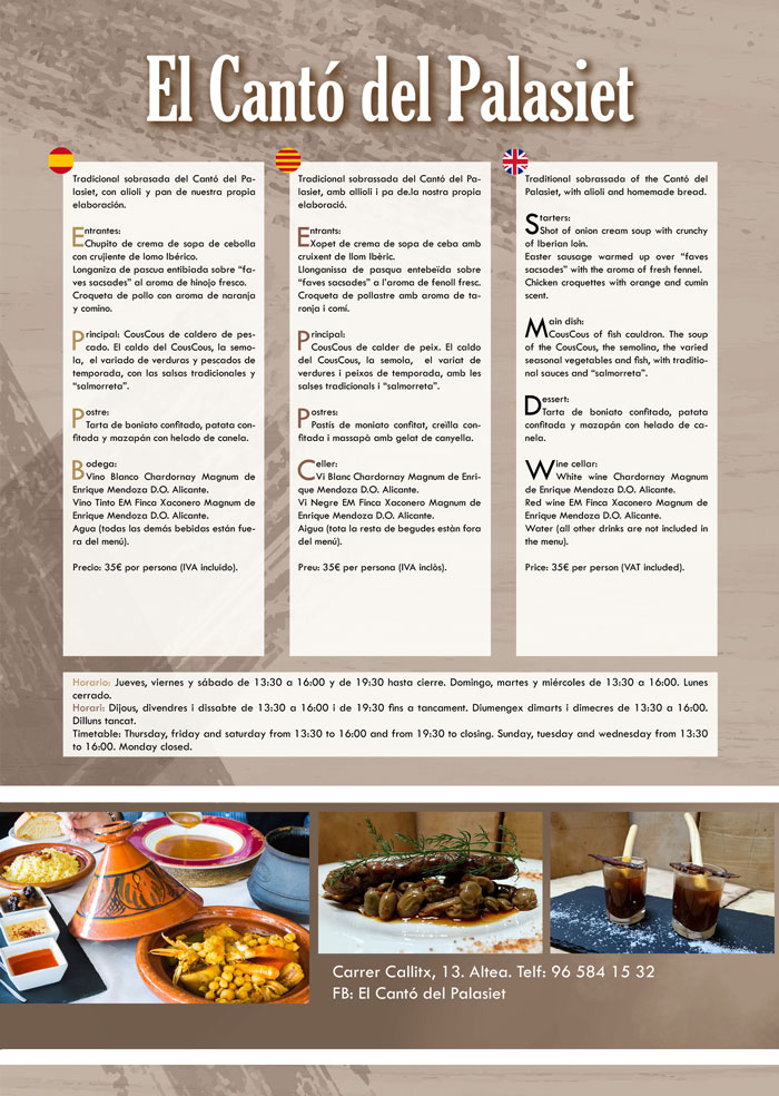 Horario del menú: Jueves, viernes y sábado de 13:30 a 16:00 y de 19:30 a cierre. Domingo, martes y miércoles de 13:30 a 16:00. Cerrado los lunes.