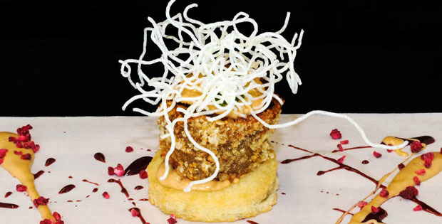 Ingredientes: Confit de pato, salsa hoisim, huevo, fideos de arroz, pan al vapor, frambuesas, liogilizada. Descripción: Jugoso rulo crujiente de pato sobre una torta de pan al vapor con salsa hoisim de frutos rojos.