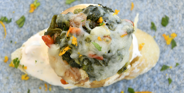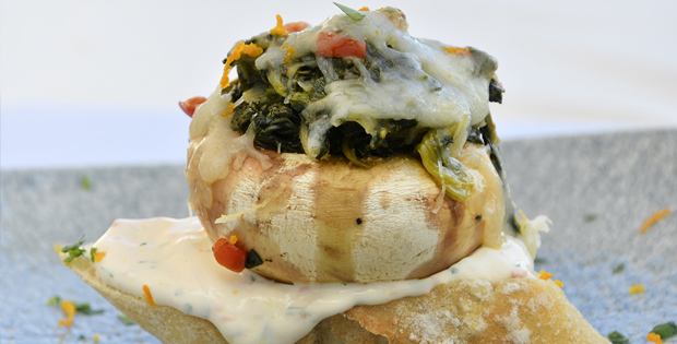 Champiñón relleno de espinacas, pasas, ajo, pimiento rojo, queso