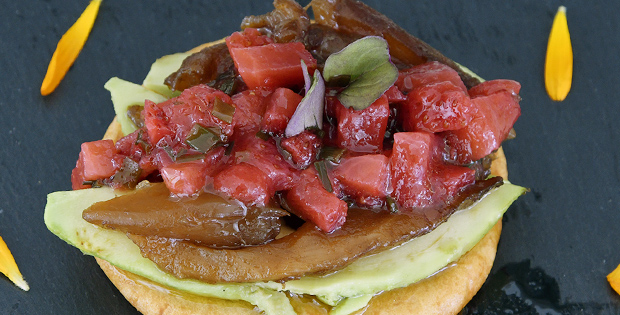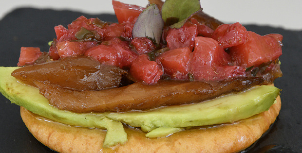 Crujiente de caballa y fresas marinadas en soja. Horario de la tapa: De 12:00 a 14:00 y de 19:00 a 21:00 Domingos cerrado.