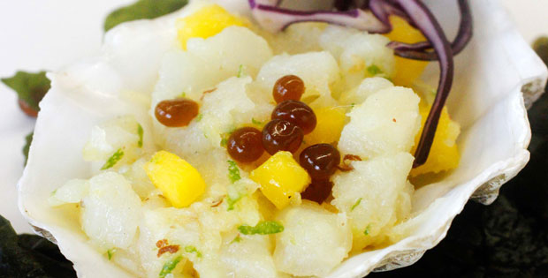 Ingredientes: Corvina, pimienta de Sichuan, lima, mango y mazana granny Smith, aceite de sésamo, ostra, alga wakame, col lombarda. Descripción: Sobre una base de col lombarda se coloca la concha de la ostra con un tartar de corvina realizado con la corvina, el mango, la manzana, la lima, la pimienta y el aceite de sésamo. Se termina con un caviar de salsa de ostras y el alga wakame.