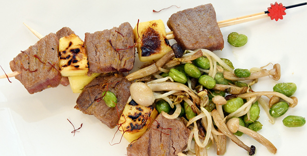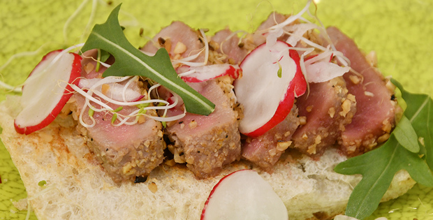 PINCHO/ TAPA Tataki de atún con cacahuetes sobre galleta cracker 4.50 € PLATO 2 morunos de atún con mango 15,00 €