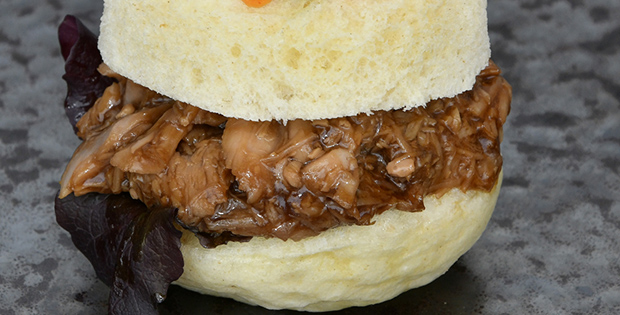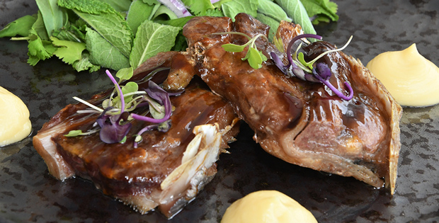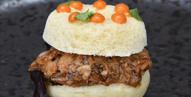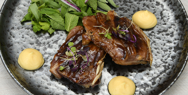 PINCHO/ TAPA Pan nube de carrillera de atún con mishonesa 5.50 € PLATO Parpatana con glaseado coreano, puré de apionabo y bouquet de hierbas 19.90 €