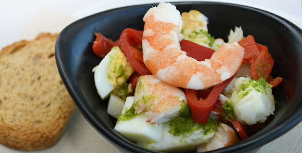 Mezcla de merluza, langostinos, huevo cocido y pimiento rojo, troceados y acompañados de una deliciosa salsa verde.