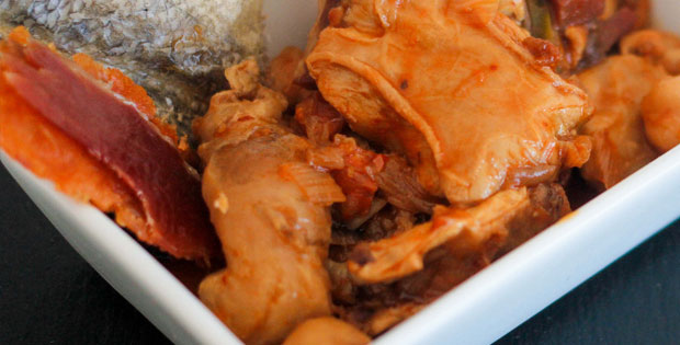 Ingredientes: Callos de bacalao, ajo, vino blanco, cebolla, pimiento rojo, pimiento verde, tomate, pimentón.