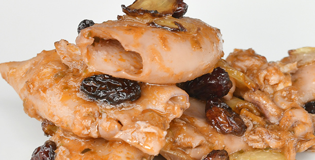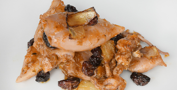 Calamares de bahía en salsa, sobre cama de cebolla caramelizada y pasas sultanas.