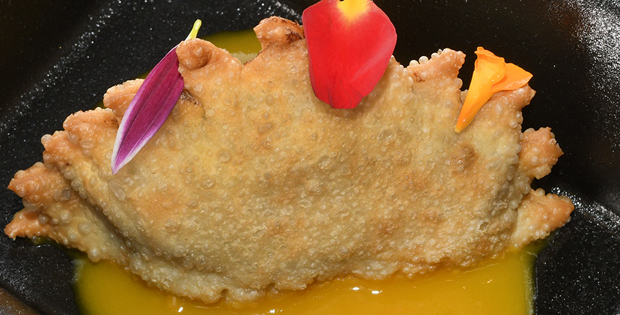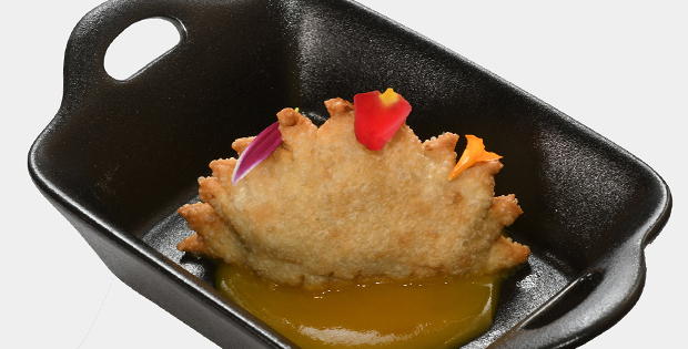 Empanadilla tradicional rellena de pollo al curry, con una base de texturas de piña colada.