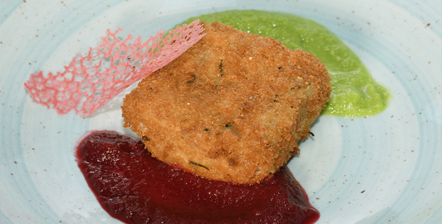 Corazón de alcachofa con secreto ibérico cocinado a baja temperatura y empanado sobre crema de guisantes.