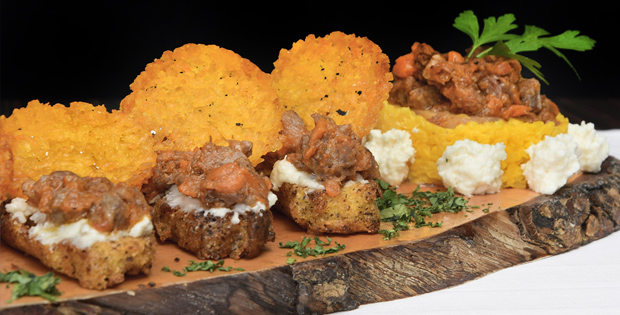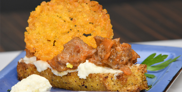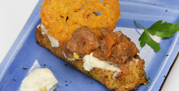 Lingote de polenta con crema de parmesano, ossobuco de ternera con verduras y crujiente de risotto.