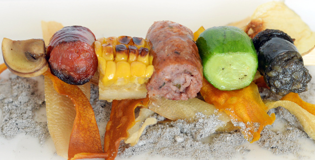 Ingredientes: Pulpo, espárragos, maíz, cebolla, lima, chimichurri, vinagre, sal, pimienta. Descripción: Pinchar el pulpo en la brocheta. Reservar. Cortar la verdura a dados regulares y aliñar. Marcar el pulpo en la plancha y añadir chimichurri.