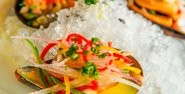Ingredientes: Mejillón, apio, pimiento rojo, ají, cebolla morada, lima, limón, eneldo, cilantro, cebollino, xxxx, vinagre manzana, salsa agridulce, orégano, laurel, zanahoria. Descripción: Es un mejillón tipo nuestro tradicional mejillón vinagreta, pero con toques peruanos del plato típico de allí “conchas a la chalaca”. Una fusión de dos platos típicos que tienen una combinación de sabores muy similares pero con productos diferentes.