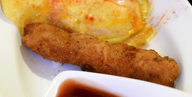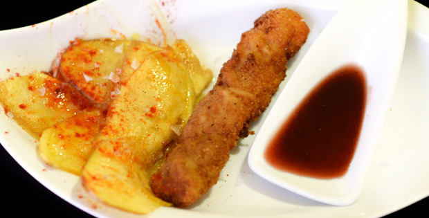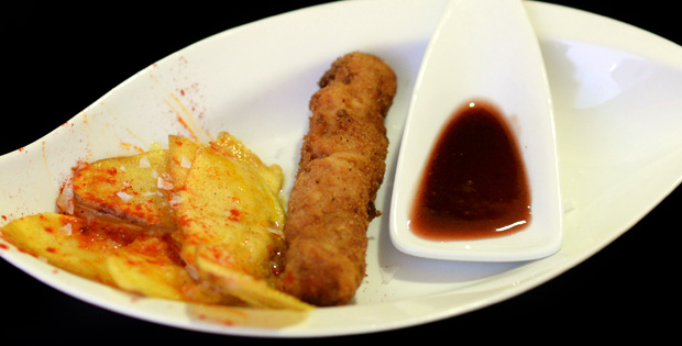 Flamenquin relleno de jamón serrano y queso manchego sobre cama de frutas del bosque, cola y vinagre de modena