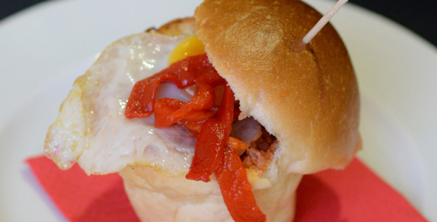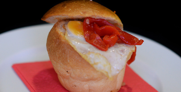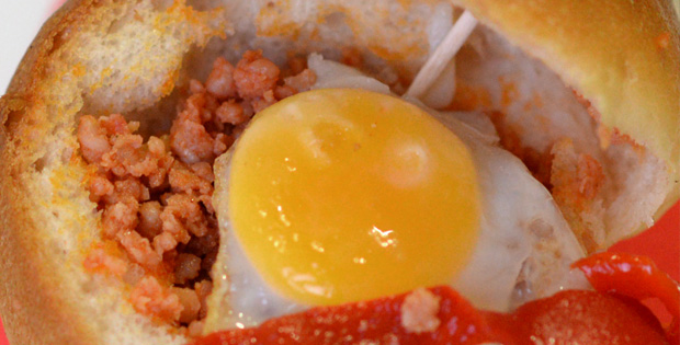 Pan relleno de picadillo de chorizo con ligero toque picante y huevo de codorniz
