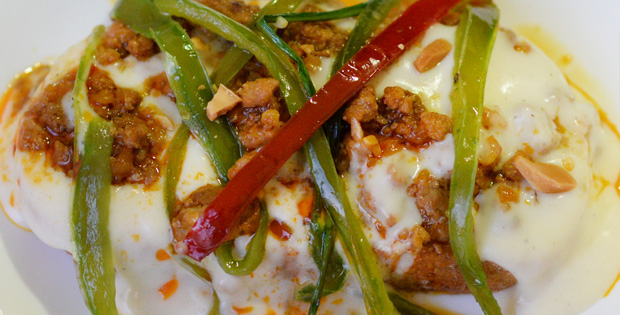 Pan, carne en salsa, pimiento y cebolla caramelizados, bechamel, y almendras tostadas