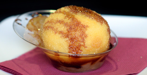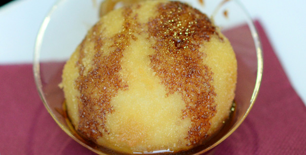 Patata rellena de carne con un puntito de picante y rebozado crujiente.