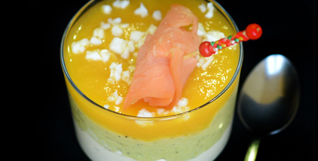 Salmón, atún, huevo, queso fresco, aguacate, sal, pimienta, melocotón en almíbar y huevo rallado