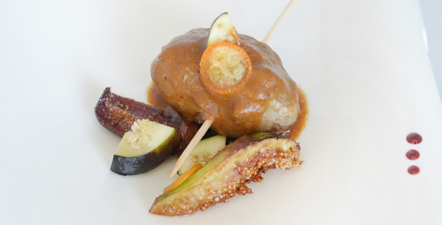 Brocheta de carrillera estofada en su jugo reducido con vino tinto e higos