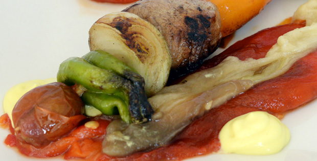 Brocheta de solomillo marinado en teriyaki, pimiento padrón y tomate cherry a la brasa, acompañado de berenjena y pimiento a la brasa sobre una cama de queso afuega´l pitu