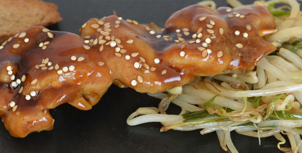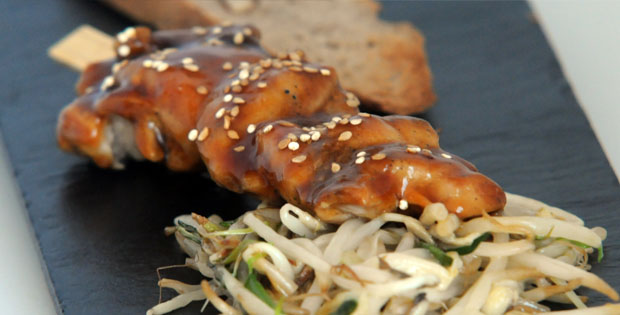 Pollo a la plancha macerado con soja, brandy, miel y jengibre, decorado con sésamo dorado sobre pan casero de nueces