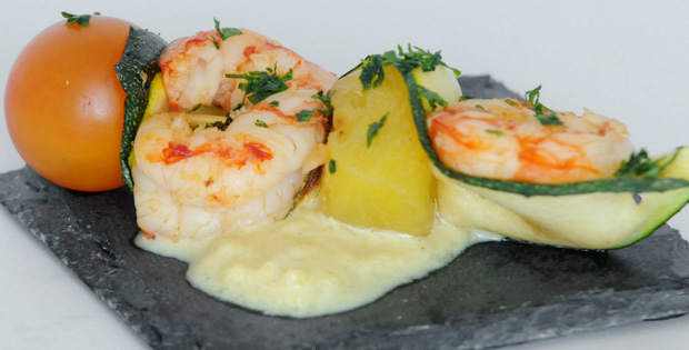 Brocheta de gambón al ajillo con láminas de calabacín a la plancha y piña