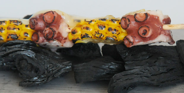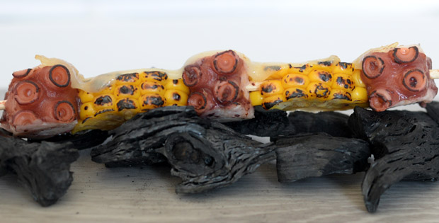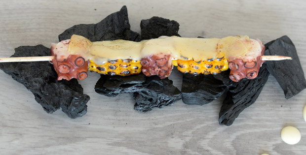 Brocheta de pulpo y mazorca de maíz al horno de carbón, gratinada con queso