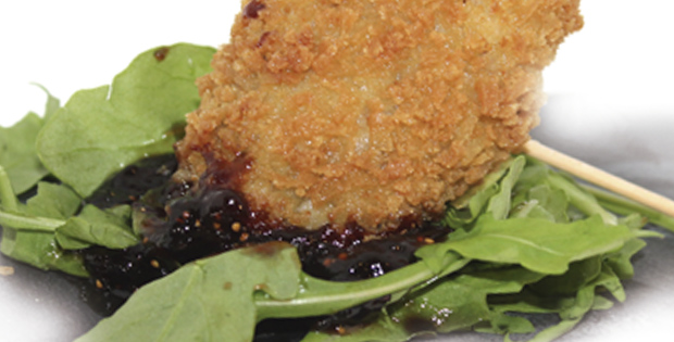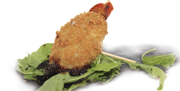 Croqueta de morcilla y manzana caramelizada sobre lecho de vinagreta de Módena con higos, brownie a la cerveza de malta con chantillí.