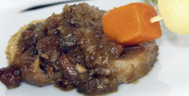 Solomillo ibérico sobre roti de patata con salsa de manzana y frutos secos. Horario de 10:00 a 23:00