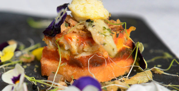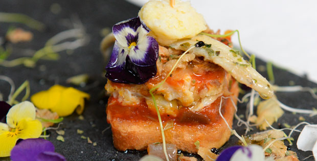 Tosta de Pisto y zarangollo con boquerón y helado de aceite de oliva - Bar Restaurante Mítico