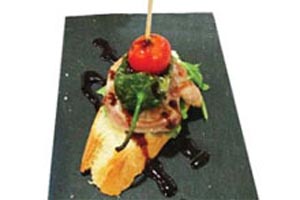 Solomillo de cerdo, rúcula, tomate cherry, pimiento de Padrón, mayonesa y reducción de vino de Oporto.