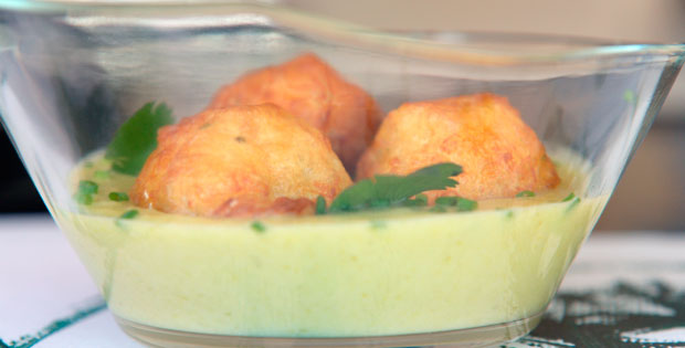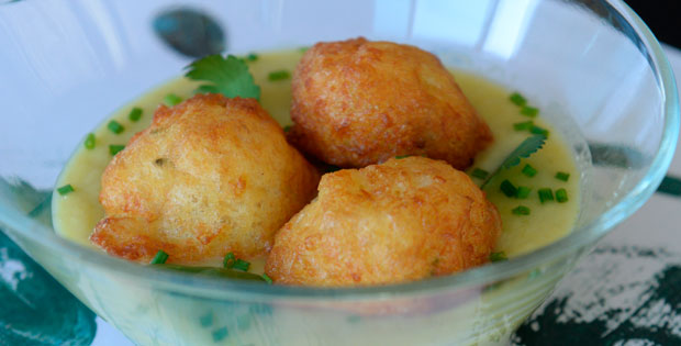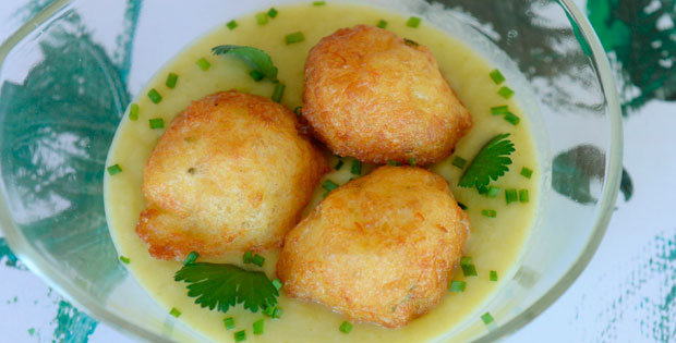 Sobre la vichyssoise fría, buñuelo de bakalao y cebollino picadito