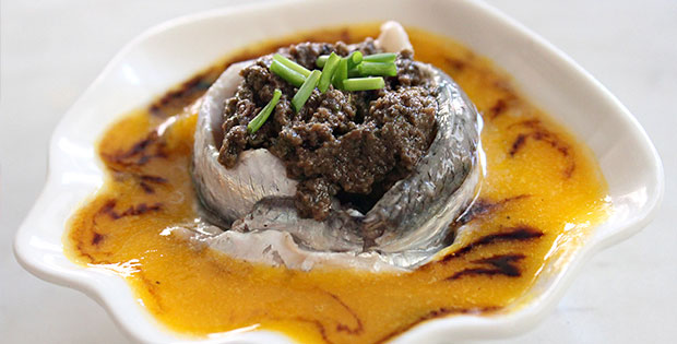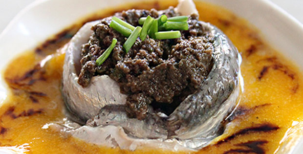 Boquerón relleno de tapenade de aceitunas negras y sopa de melón. Precio de tapa + cerveza o vino o refresco De lunes a domingo de 19:00 a 23:00h