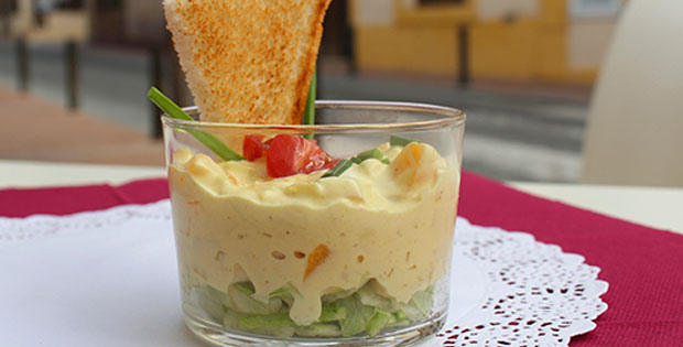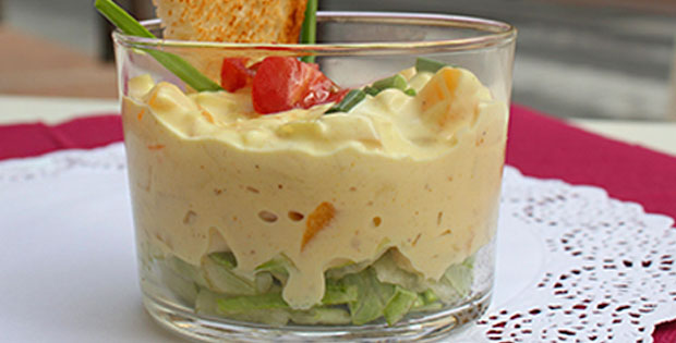 Ensalada tropical de frutas y pollo con salsa de yogurt griego y especias.