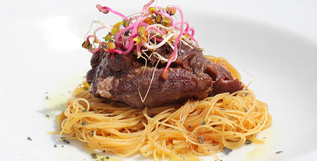Carrilera en su jugo sobre lecho de fideos chinos de arroz y salsa de soja. Precio de tapa + cerveza o vino o refresco De lunes a domingo de 12:00 a 14:00h y de 19:00 a 23:00h