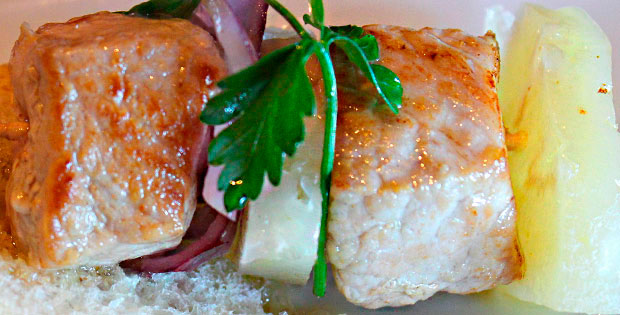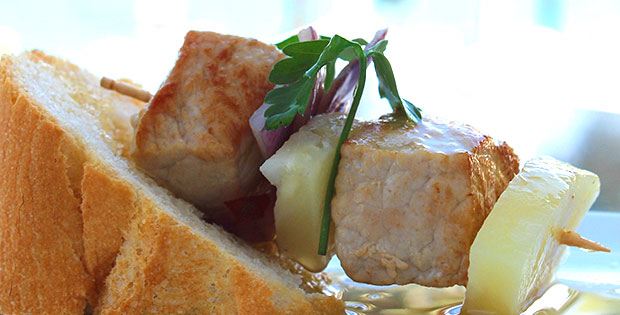 Pincho de lomo de cerdo con piña aderezado con salsa agridulce.