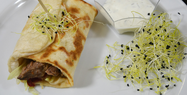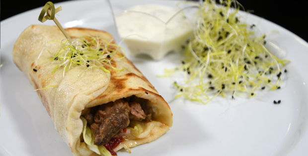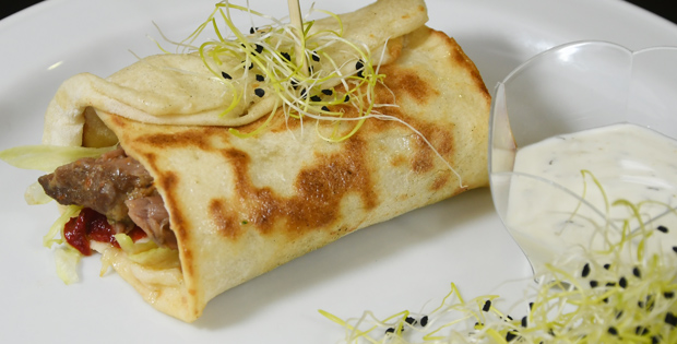 Mini rollo de masa de pizza, relleno de carrillada de cerdo, pimiento piquillo, dos quesos, lechuga y salsa especial de la casa.