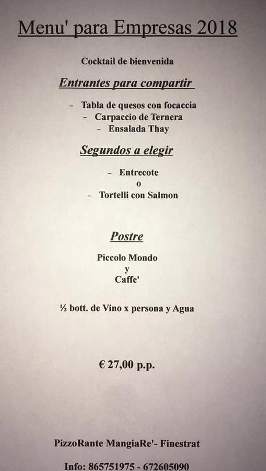 Menú 27 euros - Pizzorante Mangiare Finestrat