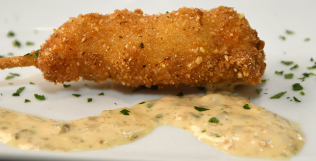 Gamba roja rebozada con crujiente de kikos y salsa Benacantil con el tono verde de sus pinos la textura granulada de su tierra y el aroma dulce de sus flores. Maridalo con una cerveza 1/5 Alhambra o una copa de vino Embaucador.