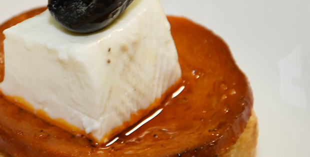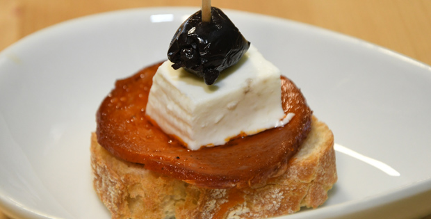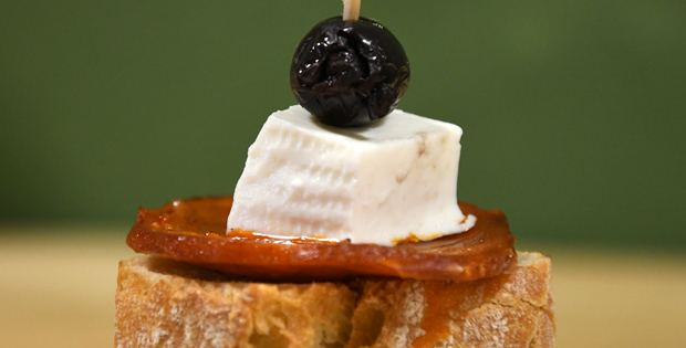 Tosta de pan, miel, sobrasada y aceituna de Aragón seca. Maridalo con una cerveza 1/5 Alhambra o una copa de vino Embaucador.