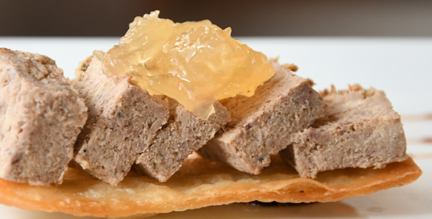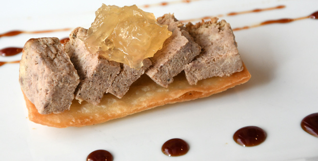 Paté de faisán con cabello de ángel sobre crujiente de trigo. Maridalo con una cerveza 1/5 Alhambra o una copa de vino Embaucador.