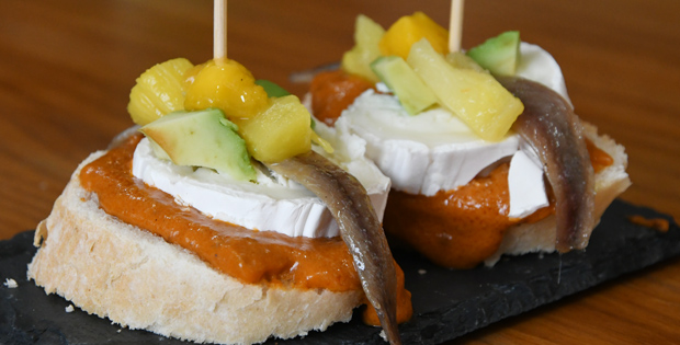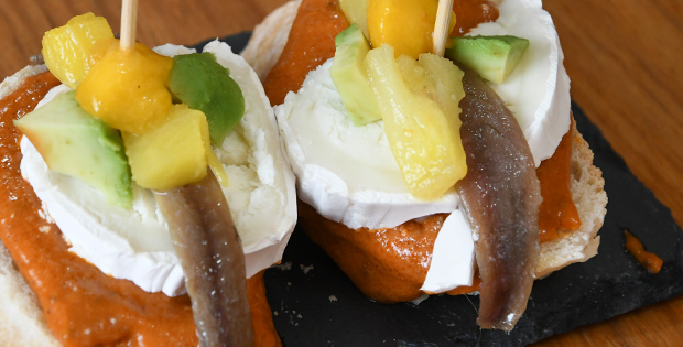 Pincho de salsa romanescu, queso de cabra con anchoa del cantábrico, aguacate, mango y piña.