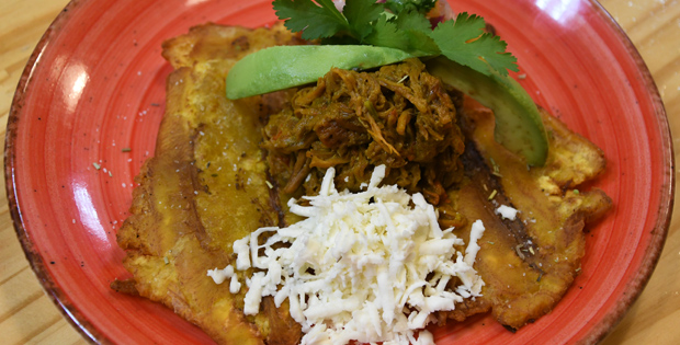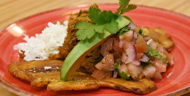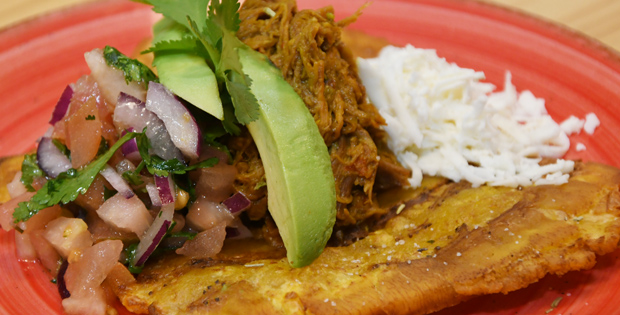Base de plátano macho verde con carne mechada de ternera con rizo de gallo de tomate, cebolla, cilandro y aguacate, acompañado de queso. Maridalo con una cerveza 1/5 Alhambra o una copa de vino Embaucador.