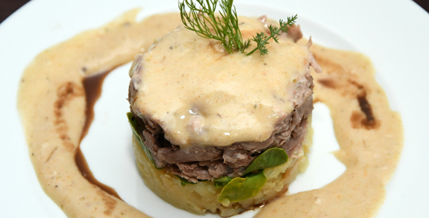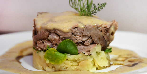 Base de patata a lo pobre, rúcula y carrillera desmechada con su crema al chocolate.